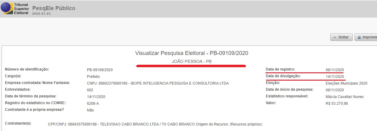 O Ibope registrou neste domingo a terceira e última pesquisa para saber a intenção de voto para prefeito de João Pessoa. O resultado será divulgado no próximo sábado, dia 14, véspera da eleição pela TV Cabo Branco, empresa que contratou a pesquisa.