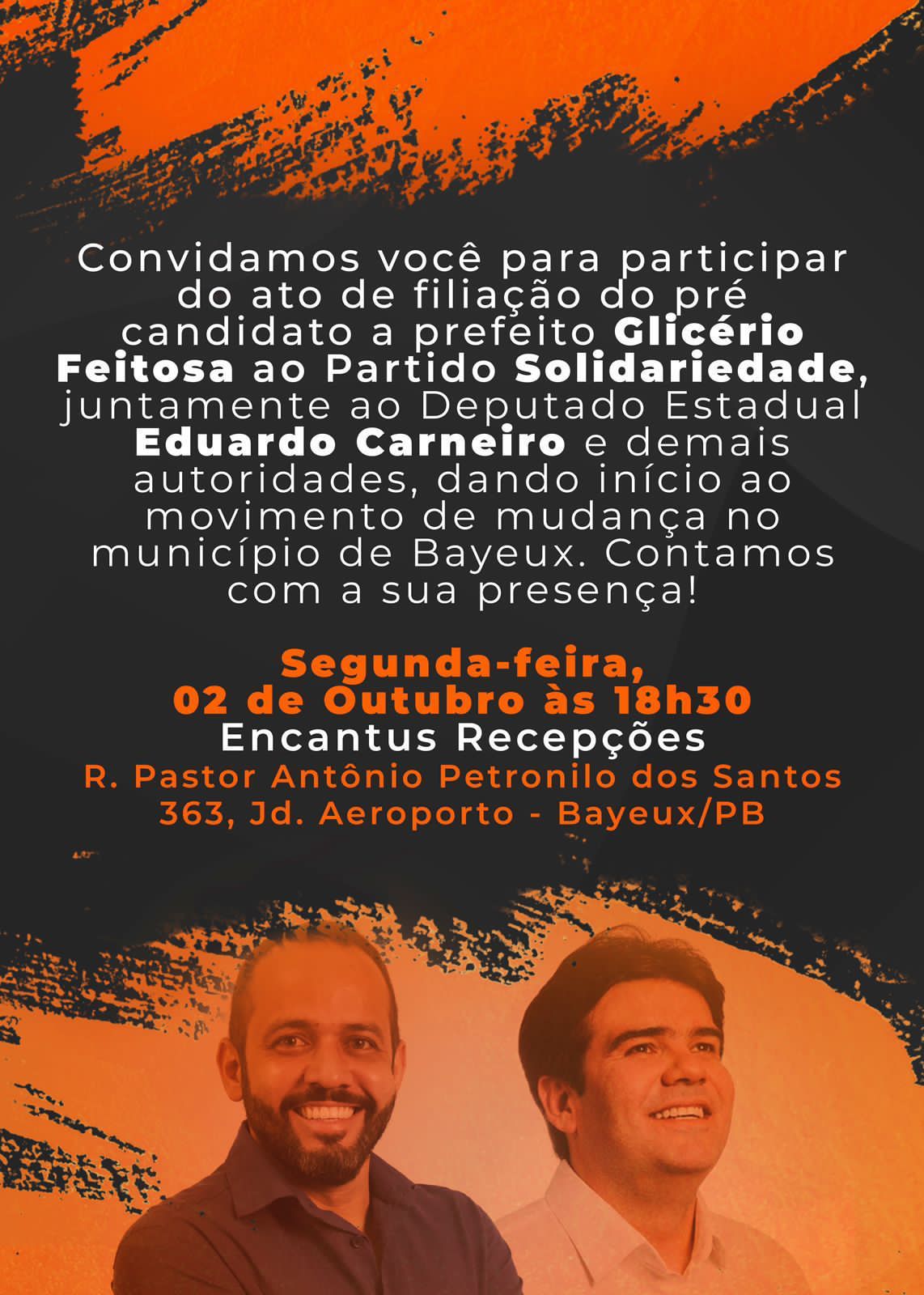 “É chegado o inicio de uma grande mudança na cidade de Bayeux. E, para isso, convido você para a minha filiação ao partido Solidariedade, oficializando a nossa pré candidatura a Prefeito, com a presença do presidente estadual Eduardo Carneiro, e demais lideranças e autoridades. Será nesta segunda feira, 02/10, as 18:30 na Encantus Recepções no Jardim Aeroporto. Conto com a sua presença, venha fazer parte da mudança que Bayeux precisa!” diz convite de Glicério.