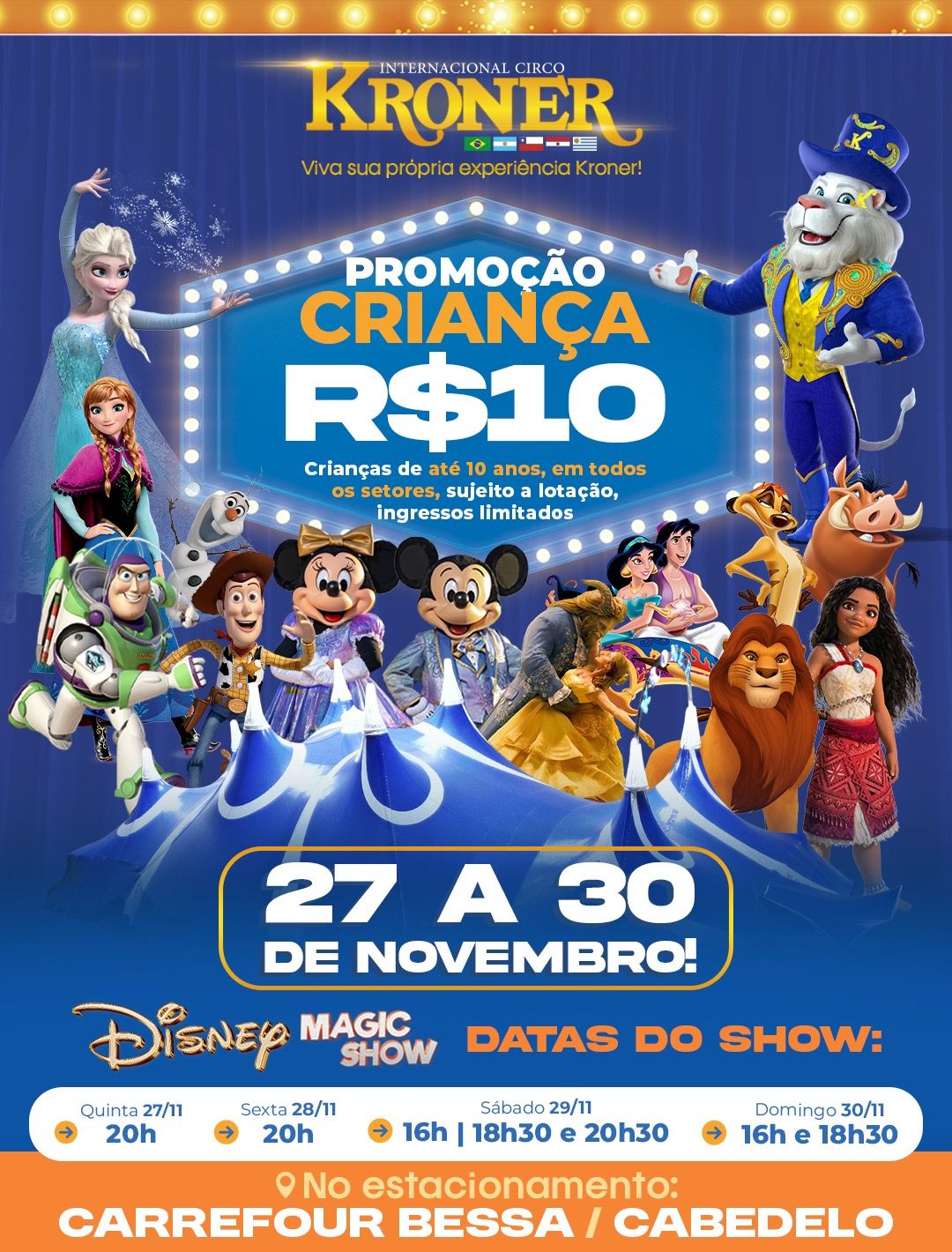 A magia da Disney vai tomar conta do picadeiro! De 27 a 30 de novembro, o Internacional Circo Kroner apresenta o Disney Magic Show, um espetáculo especial que promete encantar crianças e adultos com seus personagens favoritos e números circenses de tirar o fôlego. A temporada acontece na lona exclusiva montada no estacionamento do Carrefour Bessa, garantindo fácil acesso e toda a infraestrutura que consagrou o Kroner como um dos maiores circos da América do Sul.