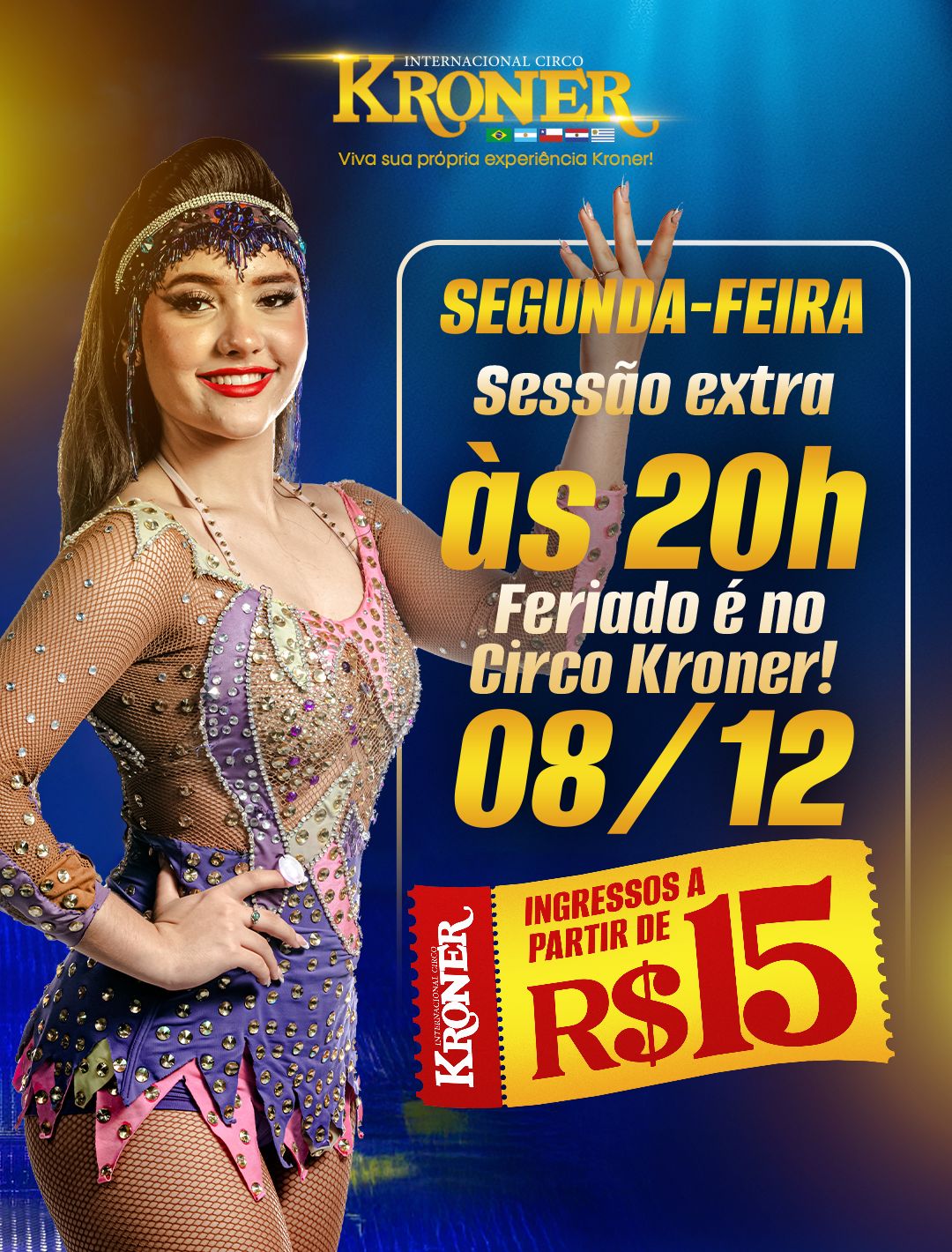 O Internacional Circo Kroner, instalado no estacionamento do Carrefour Bessa, em Cabedelo, preparou uma programação especial para o feriado desta segunda-feira, 8 de dezembro. Além da sessão extra de hoje, às 20h, o público contará com uma agenda promocional ao longo da semana — com exceção da terça-feira (09/12), quando não haverá espetáculo.
