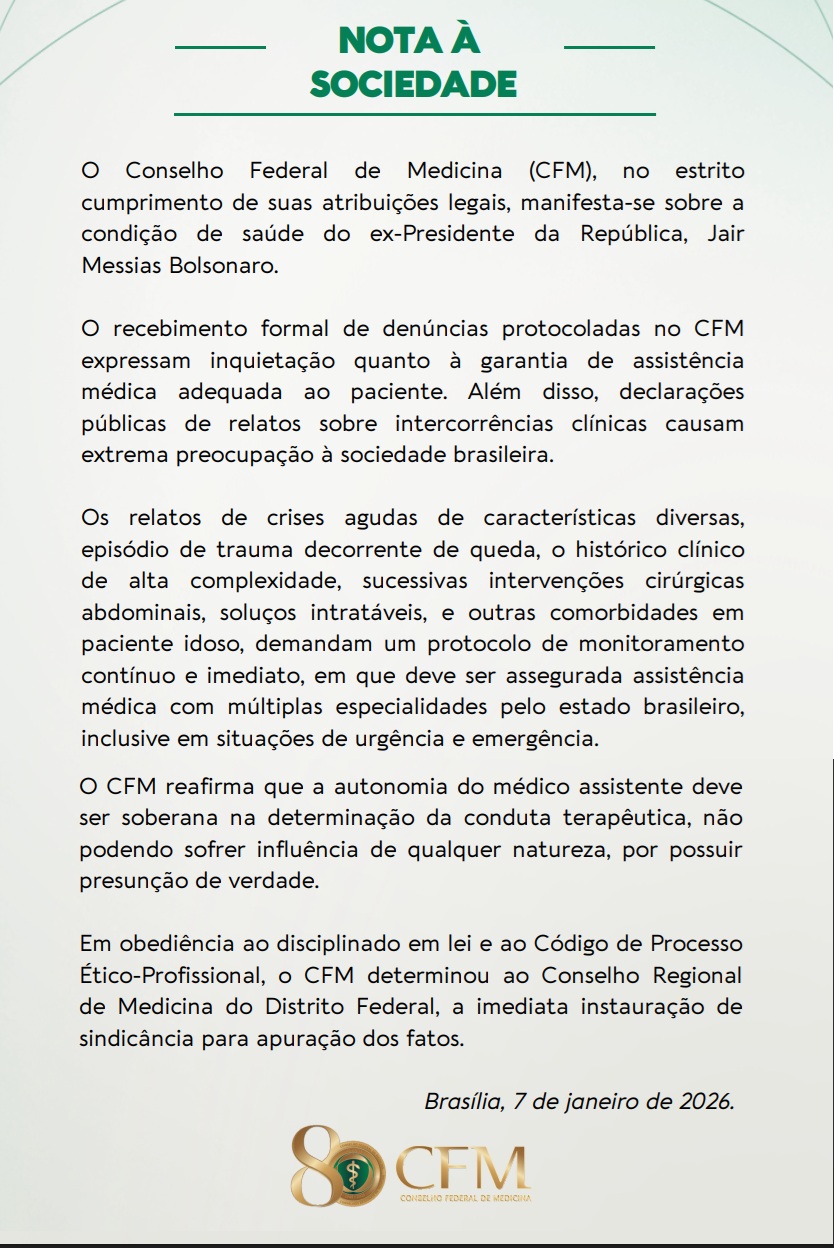 NOTA DO CONSELHO FEDERAL DE MEDICINA – O Conselho Federal de Medicina (CFM) divulgou, nesta terça-feira (7), Nota à Sociedade na qual se manifesta sobre a condição de saúde do ex-presidente da República Jair Messias Bolsonaro. No documento, a autarquia informa ter recebido denúncias formais que expressam preocupação quanto à garantia de assistência médica adequada ao paciente.