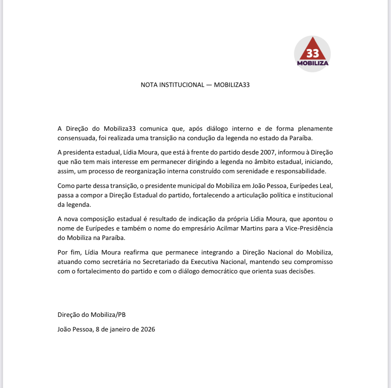 A Direção do Mobiliza33 comunica que, após diálogo interno e de forma plenamente consensuada, foi realizada uma transição na condução da legenda no estado da Paraíba.