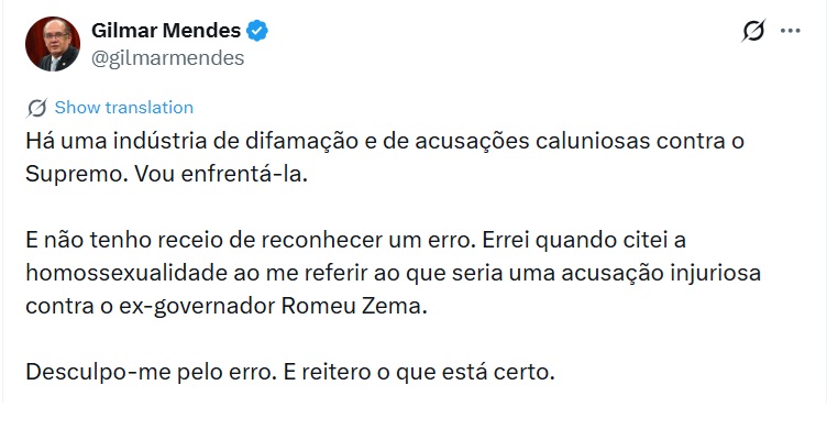 O ministro do Supremo Tribunal Federal, Gilmar Mendes, pediu desculpas públicas, através das redes sociais, por ter se referido a homossexualidade como uma acusação injuriosa contra o ex governador de Minas Gerais, Romeu Zema.