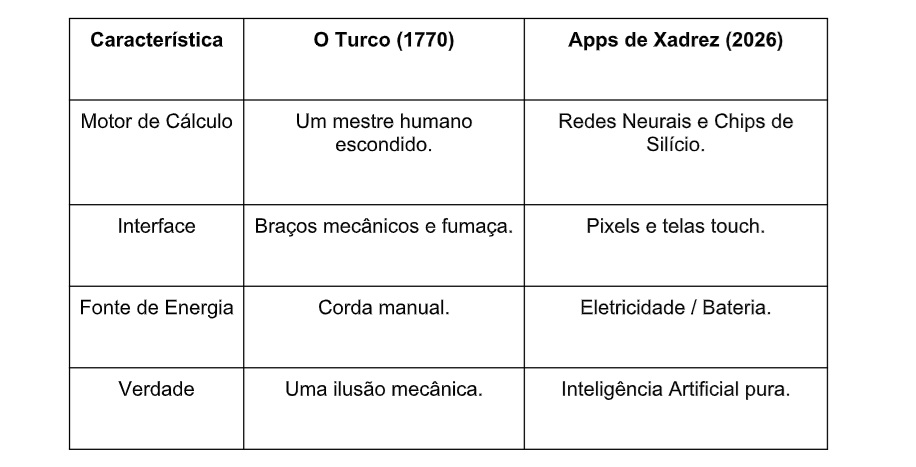 Hoje, não precisamos mais de armários com fundos falsos. O Turco moderno vive no seu bolso, processando o gambito da dama em milissegundos. Mas a mística permanece: toda vez que você olha para uma tela e se pergunta “como ele viu esse lance , você está sentindo a mesma perplexidade de um espectador de 1770
